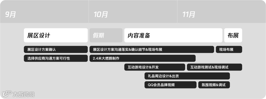 整个项目过程需耗时两个多月,分为三个阶段:展区设计阶段、内容准备阶段、布展阶段。线下项目周期较长,涉及内容较多,所以前期需要规划好时间及工作安排。