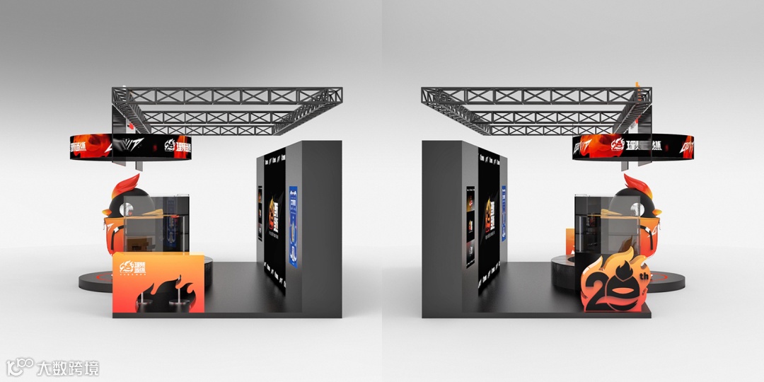 所以我们在大燃鹅背后放置了一块半圆形的曲面LED屏,顶部吊装了一个环形LED屏,同时两侧也吊装两块LED屏以呼应,标题立体灯箱居于展位顶部正中间,所有屏幕联动播放烈焰视频,营造出一个激昂、热血的氛围。