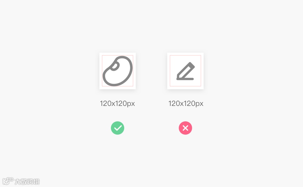 图标规范也会影响组件库的整理和日常使用,在做图标组件时,需要定义好图标的最大范围和最小范围,嵌套起来使用才不会出错。图标的规范要严谨,同一个尺寸下的图标视觉面积要保持一致。不然在大小这个层级就会出现,虽然是相同尺寸的图标切图范围,但图标的体量看起来却并不一致。