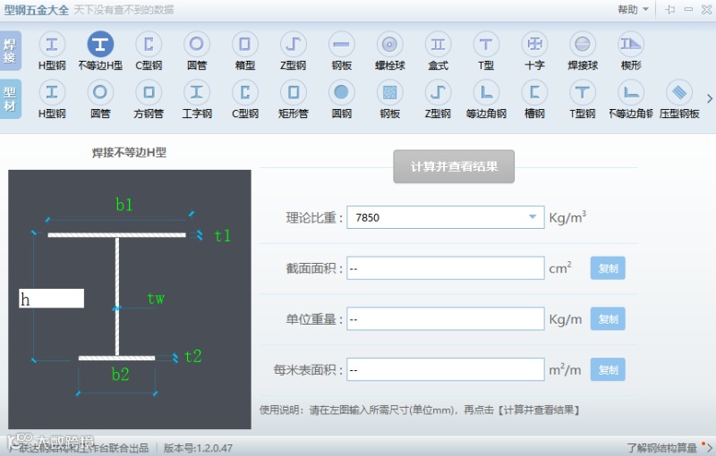 使用方法:按类型选择不同规格搜索,即可看到对应规格重量、表面积、截面积等结果。