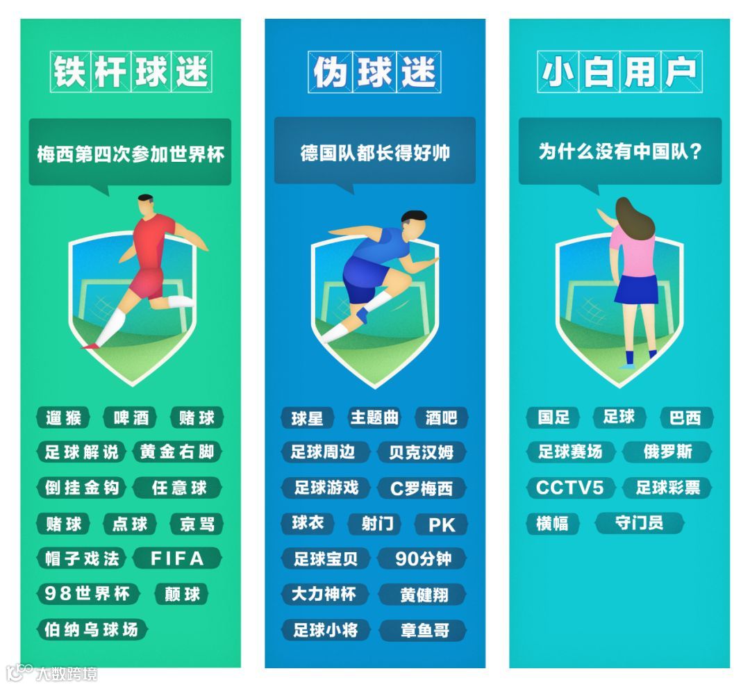 对于QQ这样亿万级的产品,要想带动全民参与,目标用户就一定不能局限。观看世界杯的球迷可分为三类铁杆球迷、伪球迷、蹭热点的小白用户,而这三类用户也包含了能参与活动的绝大多数,所以在第一轮方案策划我们找了三类不同的用户进行访谈,提炼符合目标用户认知的设计元素。