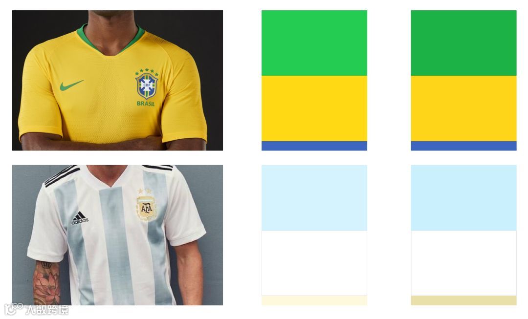 在赛场上,为了彰显自家球队精神,每支球队都指定了代表色,将其运用在徽章、球衣等地方。众所周知,巴西国家队的传统球衣是热情洋溢的黄绿色搭配,犹如狂野的热带雨林;阿根廷是其国旗的配色:浅蓝和白色作为主色,搭配精致的金色;另一支赫赫有名的球队曼联因其俱乐部徽章是一只手持三叉戟的红色魔鬼而被称为“红魔”:每次曼联出场,球场都会变成红色的海洋。
