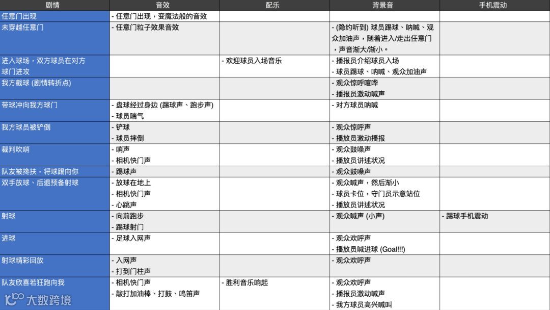 另外,球场上不可缺少的,便是观众的加油、吶喊和鼓噪声,加上球员奔跑、踢球和喘气的声音,这些音效彼此之间的堆栈与错落,除了要配合剧情演进与场上变化,体现球场当下的状况,也需反映球场观众的情绪起伏,比方说屏气凝神等待射球的那一刻,转瞬间球破网而入,全场欢声雷动,或是球员盘球杀入禁区,即将射入致胜一球,却被敌方犯规功亏一篑,这些情绪的转折点,透过声音的操弄,有时比起视觉更具感染力,更容易让用户沉浸在比赛氛围中。