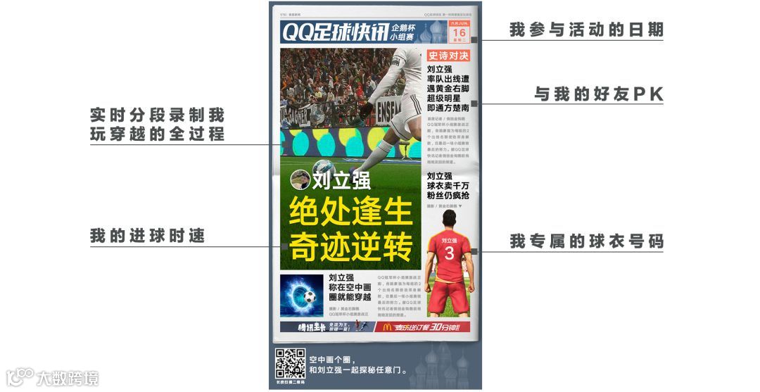 故事中主角之所以是主角,是因为他有自己独特的光环让众人印象深刻。前面我们从代入感、使命感给予了用户更加立体的参与感受,那么,如何让用户将自己所参与的情绪表达出去能,这就需要最后的成就感所达成。世界杯活动中我们将用户化身为赛场上的一员,而这个过程我们希望后台进行了全程记录,就像现实生活中的记者一样,将这个令人兴奋的过程记录下大,并通过报纸的形式铺天盖地的告诉大家。让主角不是自娱自乐,而是可以面向全员炫耀的一场故事讲解,获得自我的成就感,从而也带动了用户的参与感。