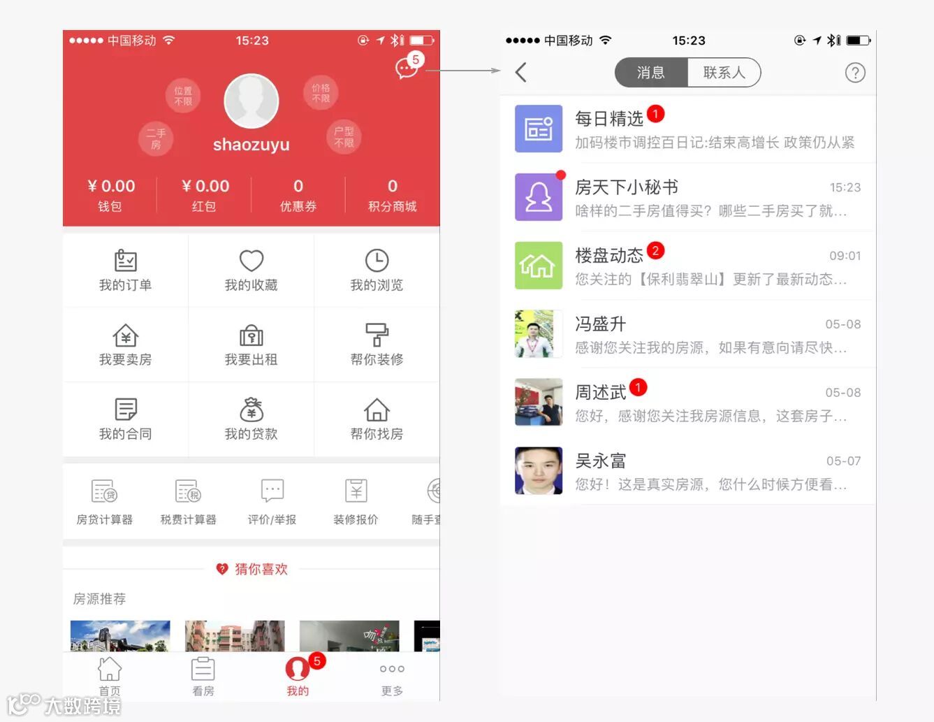 如下图App中,右上角的消息入口显示红点+数字5,轻触进入下一层级后,显示的小红点数字为1+2+1=4,与上一层级的数字5不一致,导致与用户原本的预期产生偏差,而产品本身的专业性也会受到用户质疑。