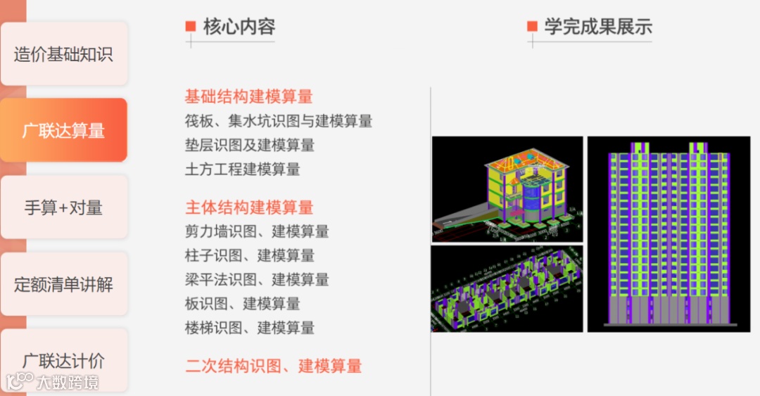 4、拥有2套项目经验。课程里面包含高层框剪和别墅两套案例,从识图,算量到组价完整讲解,学完可以用到两套案例经验。