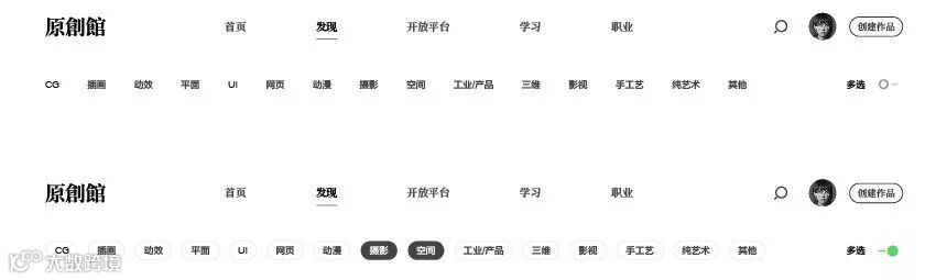 在资源内容的筛选与用户体验上开创了一种别致的用户体验设计形式,通过开关形式来进行单选资源分类与多选资源分类的区别。相较于传统的设计资源平台网站,在用户操作形式上,让用户免去思考过滤繁琐的信息,可以快速筛选内容;在视觉形式上,简化了头部的区域。