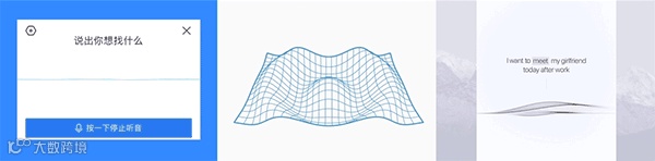 立体波动多用来表示音量。与传统的二维波动最显著的差异是三维空间的波动拥有深度,因此它更能有效表达多种功能。立体波动最基础的使用场景:一是按键声音提示,二是通过屏幕上声波的变化来显示它听到你的声音, 其余则是依靠你的想象力。这种简单的元素,可以被重新定义在较小的空间中。因为它隐喻无限流动性,是语音检测的一个很好的交互体现。