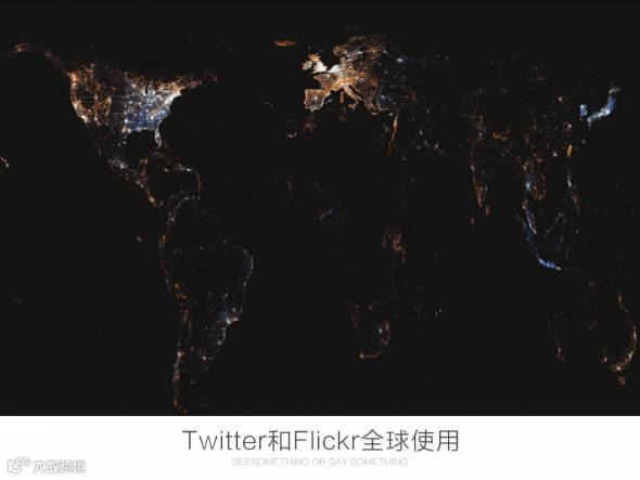 Eric Fischer针对Twitter 发短消息的位置和Flickr 拍照片的位置为数据源做的名为“看图或说话”(SeeSomething or Say Something)的大数据可视化展示,通过简单但大量的数据,做出非常美的数据图展示。