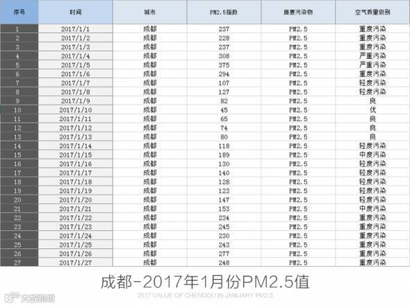 我们来看一个数据:【2017年1月28号,成都PM2.5值245】,从这个数据里能看出什么,可能只是会觉得当天成都空气质量不好,我们可能会联想到这个样一个画面。