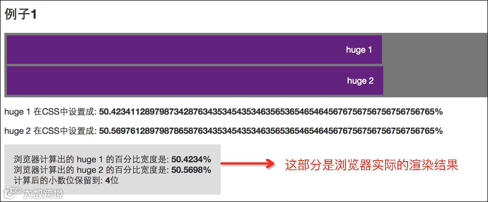 如在Safari 10浏览器中,设置了width: 50.4234112897987342876343534543534635653654654645676756756756756756765%的huge元素,其百分比最后处理成50.423411289798736%。原百分比的15、16位小数是42,但Safari最后处理成6。