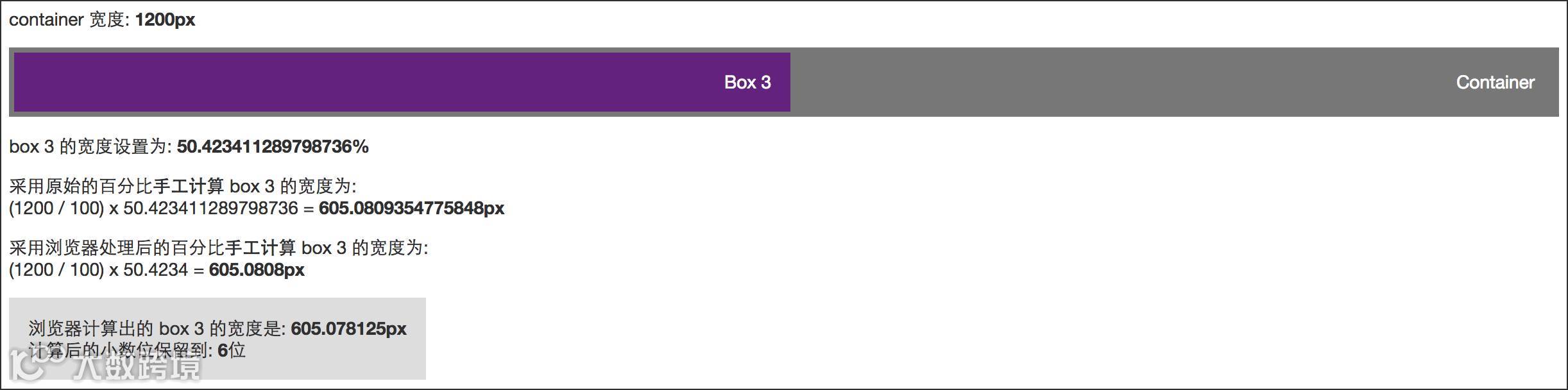 如在Safari 10浏览器中,设置了50.569761289798784%的box元素,基于container计算的宽度是606.8371354775854px,而实际渲染后的宽度值是606.828125px。