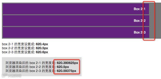 第二组是测试页面中的例子2,本组主要测试当宽度的像素值有小于1像素的值,浏览器是如何处理的。方法是设置三个box元素的宽度值分别为:620.4px、620.5px、620.6px,然后再通过重新获取浏览器渲染的宽度值。
