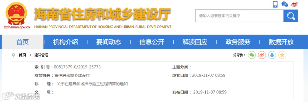 2019年11月,海南省住房和城乡建设厅发布《关于在建筑领域推行施工过程结算的通知》。