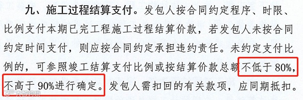 3、发包人要按约定的比例支付过程结算款,支付比例没有约定的,可通过签订补充协议将支付比例确定为80%至90%之间。