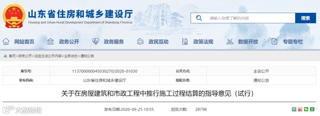2020年9月17日,山东省住房城乡建设厅、省发展改革委、省财政厅三部门联合印发《关于在房屋建筑和市政工程中推行施工过程结算的指导意见(试行)》,通过规范结算行为,缩短结算周期,减轻企业负担。