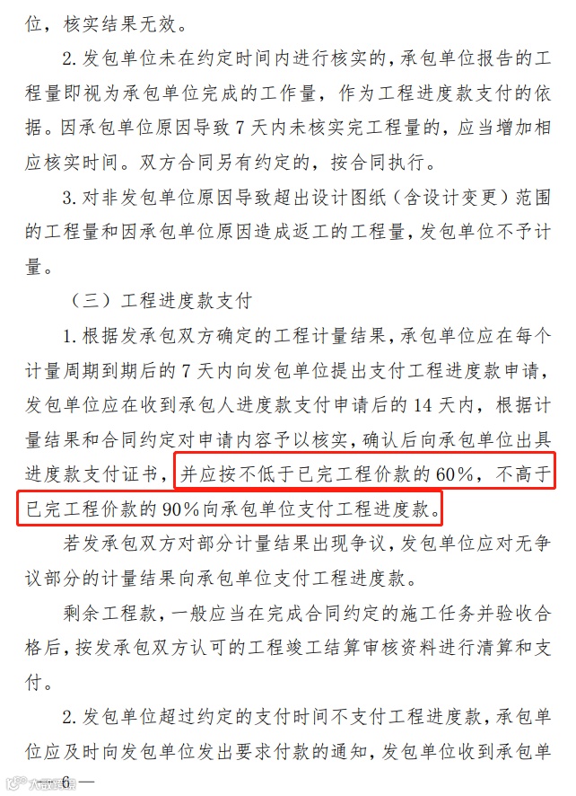 4、施工过程结算完成后,发包单位应依据已确认的当期施工过程结算文件,按照合同约定足额支付结算款。