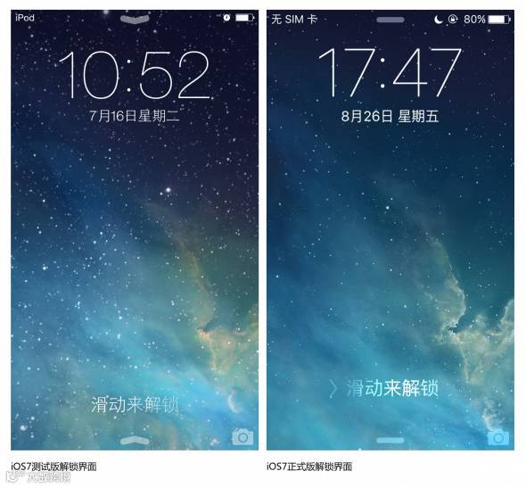 很多人可能没见过上左图的解屏界面,它只在iOS7的前几个测试版出现过,不久后,就改正了。记得那会刷iOS7测试版时,刷好后,点亮屏幕的瞬间,被这个解锁界面吓到了,让我顿时变成了一个智能手机小白,不知该如何操作,根据我有限的认知,结合解锁界面的说明文案和指引箭头,从屏幕下方往上滑了那么一下,结果操作错误,后来发现是向右滑动解锁。根据解锁界面的提示文案,和紧挨着文案的向上箭头,用户很容易将两者结合起来理解,记得那会很多人,跟我一样以为向上滑动解锁。估计iOS7的设计变化太大,苹果的设计师那会忙不过来,草率的出了这么一个存在令人误解的解锁界面扁平化设计方案。还好,没过多久,在正式版之前,就及时调整了。