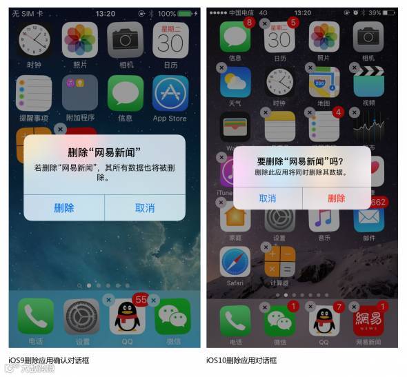 iOS10将删除应用的确认对话框中,【删除】Button的位置从左侧移至了右侧,同时从蓝色加粗,变更为了红色加粗,增强了删除操作的视觉提示。