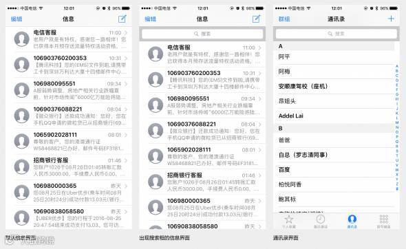 2.信息等页面搜索框默认隐藏,下滑屏幕出现,而联系人列表界面的搜索框置顶,固定在列表顶部。
