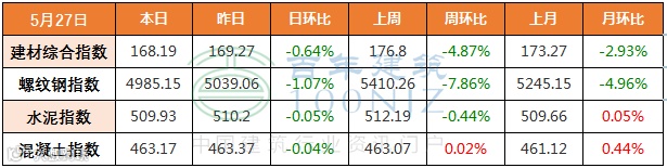 5月27日Myspic螺纹钢绝对价格指数4985.15,日环比下跌1.07%。全国31个主要城市HRB400E(20mm)螺纹钢均价5017元/吨,下跌42元/吨。重点城市:北京4990元/吨,下跌100元/吨;上海4770元/吨,下跌20元/吨;广州5100元/吨,持平;西安5090元/吨,下跌20元/吨。