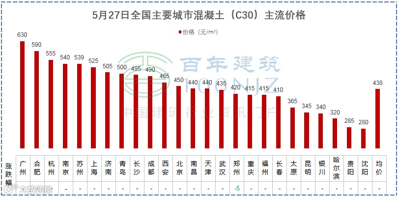 5月27日百年建筑网混凝土指数463.17,日环比下降0.04%,全国34个主要城市C30现款、非泵均价438元/方,较上个交易日持平。重点城市:北京445-465元/方;上海500-520元/方;广州610-630元/方;西安470-490元/方。