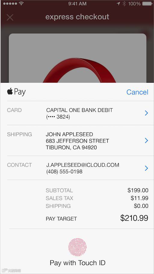 支付上拉菜单。在用户提交订单以及完成相关支付之前,Apple Pay会显示一个包含了联系方式、收货地址以及与结账相关付款信息的支付上拉菜单。尽管用户依然可以在支付上拉菜单里做些微调,比如选择不同的送货方式,但他们不用做出重大改变或输入其他信息。当用户看到该支付上拉菜单,他们应该能够立即完成交易并授权付款。