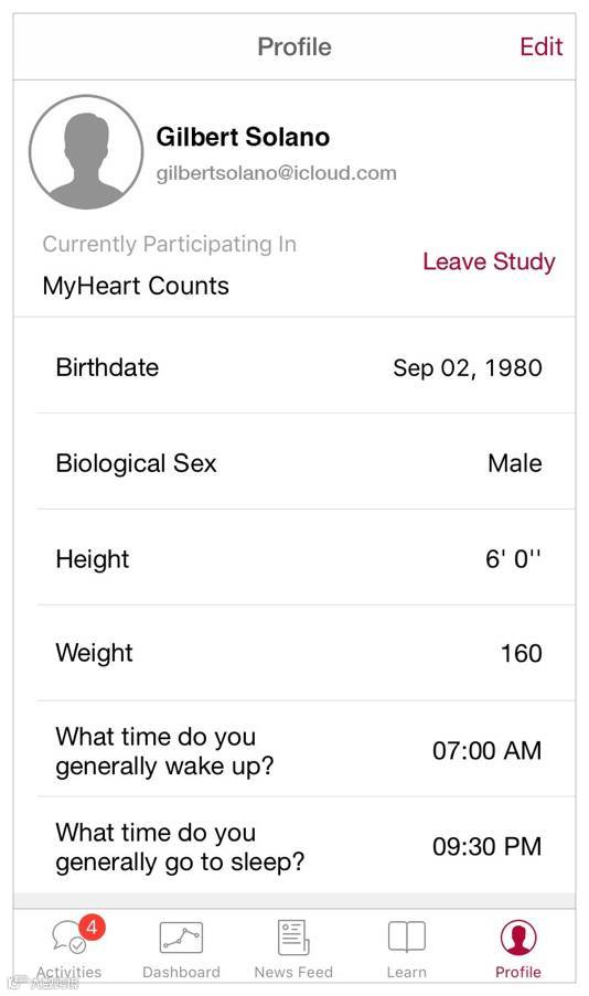 ResearchKit提供了个人档案的界面视图来让参与者可以管理他们的个人信息。此外,创建一个可以激励用户并能让他们追踪他们在研究中的进度的界面视图是个不错的选择。在大多数情况下,参加者应该能够随时访问这两个模块。