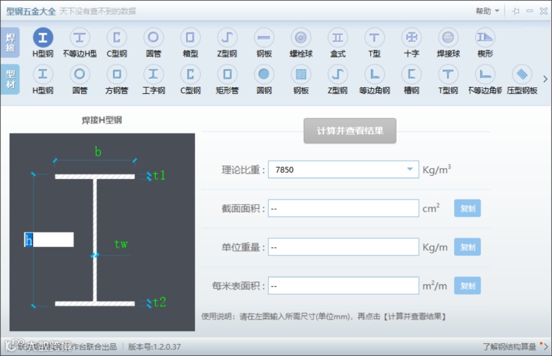 使用方法:按类型选择不同规格搜索,即可看到对应规格重量、表面积、截面积等结果