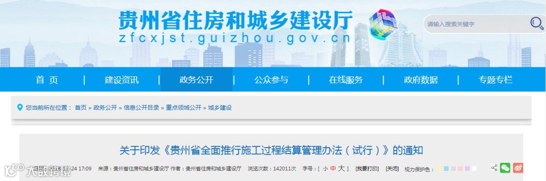 2018年12月,贵州省住建厅印发《贵州省全面推行施工过程结算管理办法(试行)》。