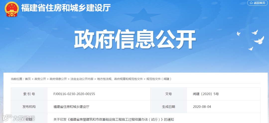 2020年8月4日,福建省住建厅、省发改委发布《关于印发《福建省房屋建筑和市政基础设施工程施工过程结算办法(试行)》的通知》。