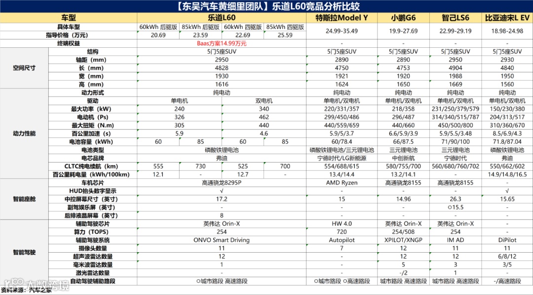 乐道L60整体定位、配置与特斯拉Model Y、比亚迪宋L EV、小鹏G6以及智己LS6相近,而乐道的优势在于,电池租用方案能让乐道L60价格低至14.99万元,相比起售价最低的比亚迪宋L EV还低了近4万元。