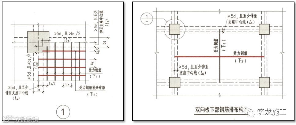 4、双向板下部双向交叉钢筋上、下位置关系应按具体设计说明排布;当设计未说明时,短跨方向钢筋应置于长跨方向钢筋之下。