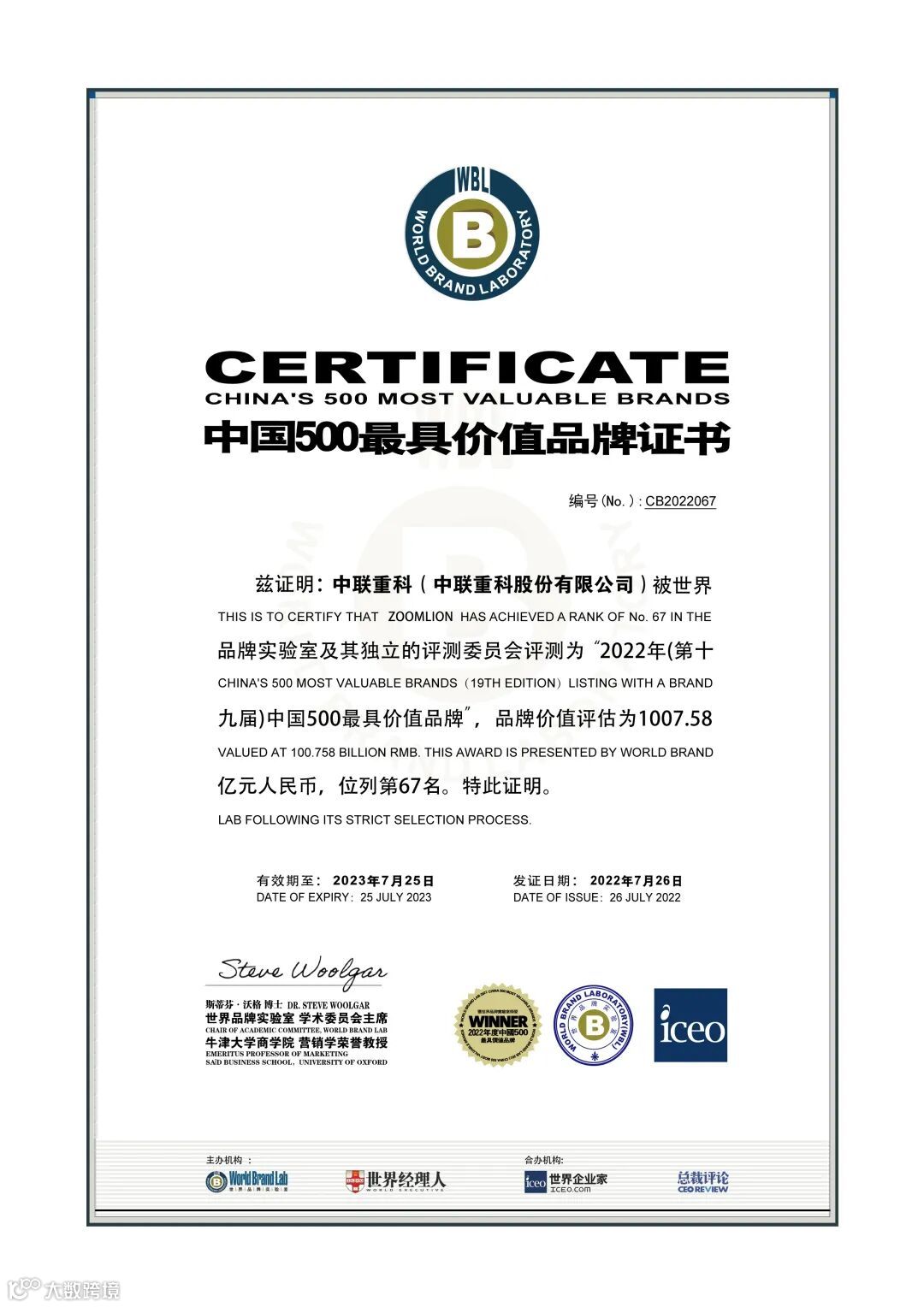 ▲中联重科《中国500最具价值品牌》证书