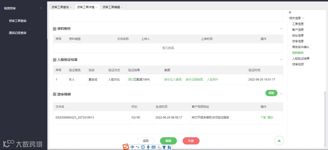 系统自动将多人,多次人脸验证数据、视频通话双录视频文件与业务单据关联,无需跨系统进行数据查询,降低了沟通成本、管理成本和操作系统的人力成本。