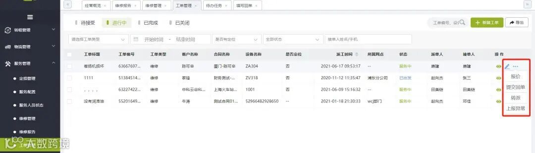 解决方案:云谷租赁维修派工模块派工人员可以查看工单目前由哪位维修人员负责,什么时候开始的维修。在维修结束后维修人员需要提交维修报告,说明维修是否完成及具体情况,派工人员审核通过后维修流程才结束。