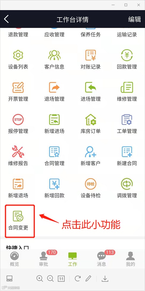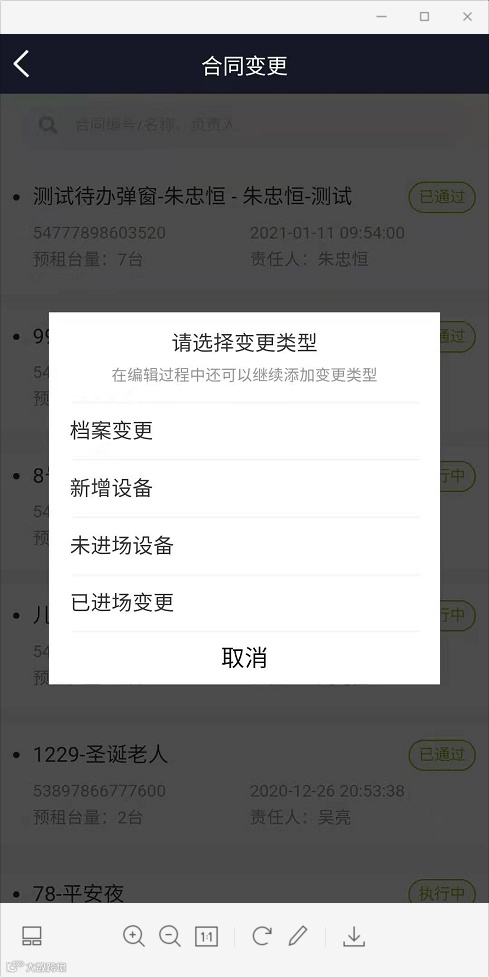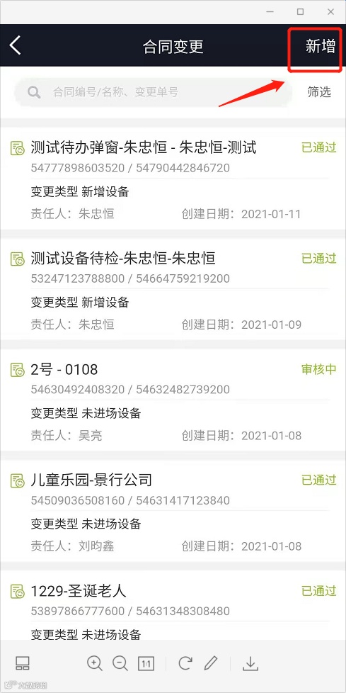 移动端工作界面,选中“合同变更”,选择需变更的合同,选择右上角“新增”;