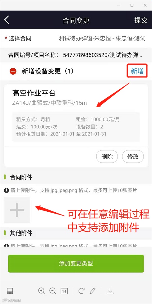 加附件,新增设备信息填写完毕后点击右上角“提交”即可;
