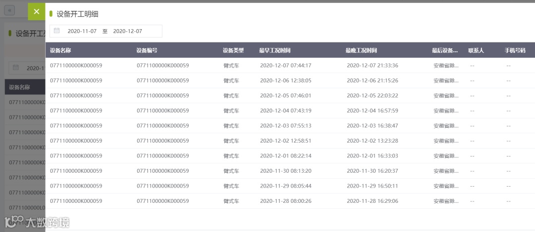 可以查看设备每天具体的开工时间和完工时间,以及设备工作地点。