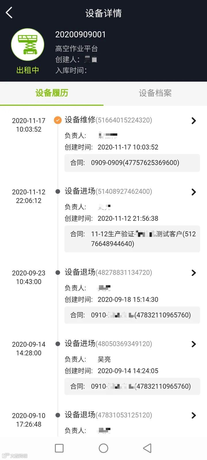 可以查看该设备所经历的项目进场详情、退场详情、所经历的项目、所做的维修和保养的信息