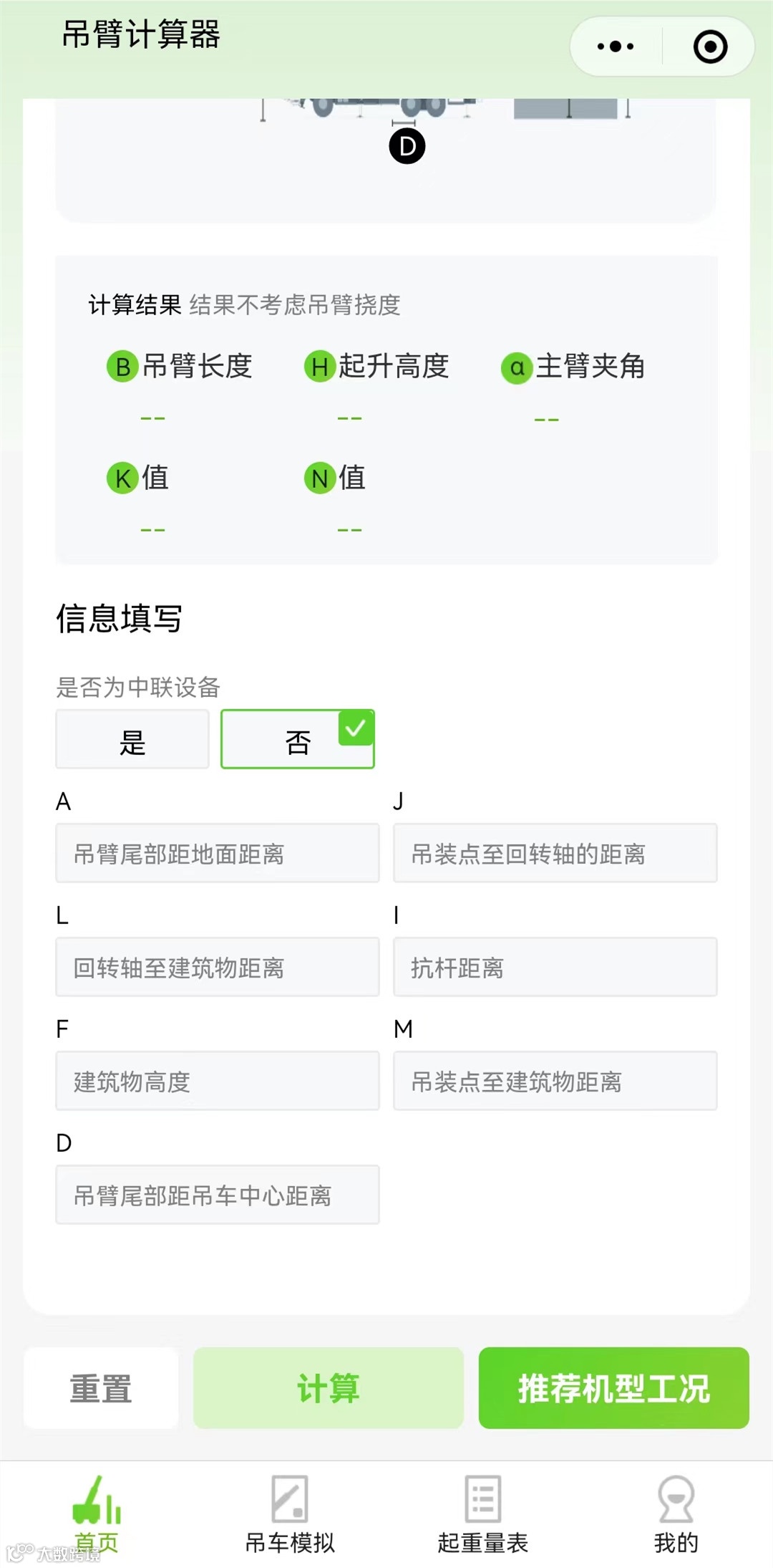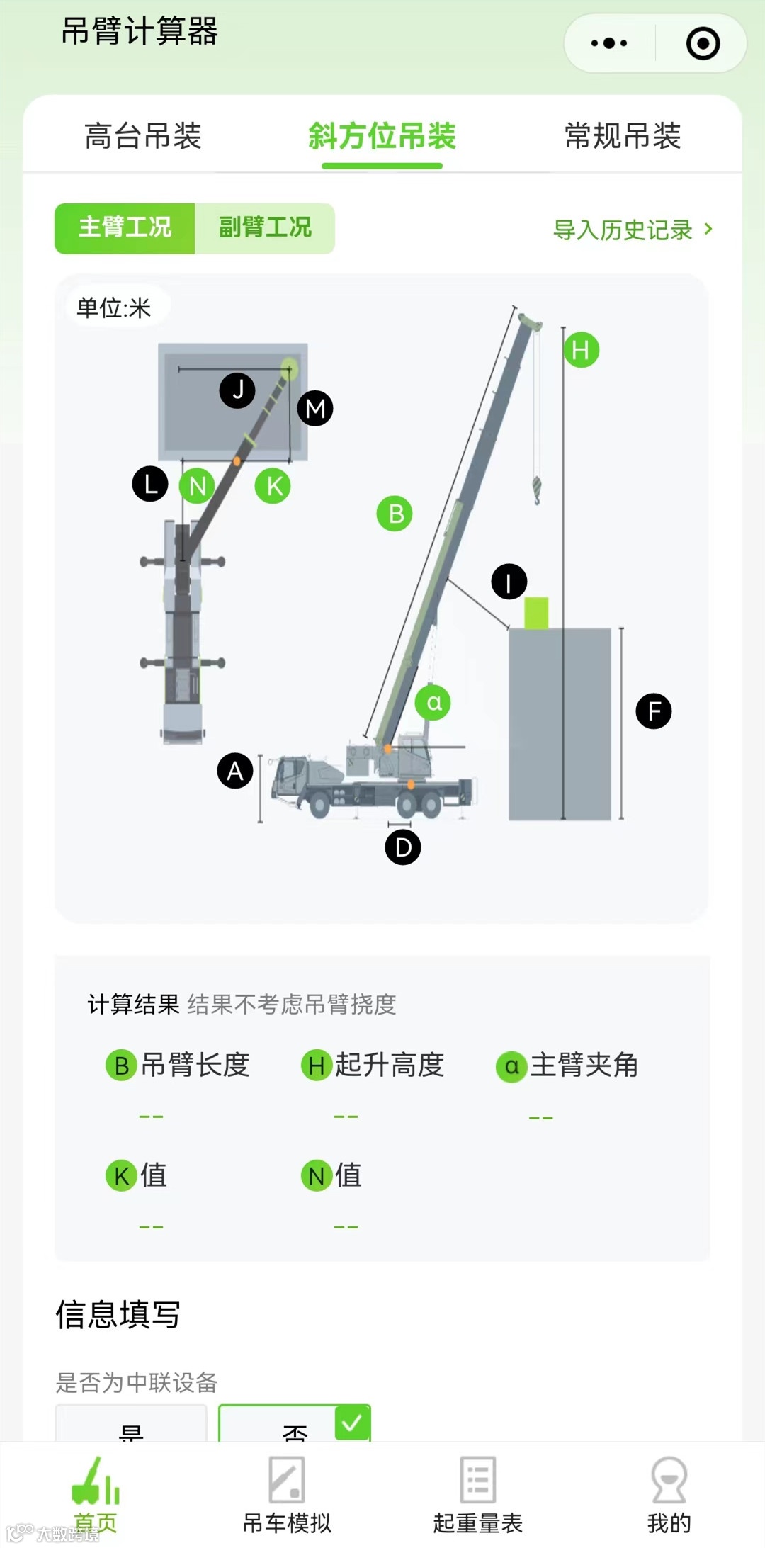 此外,中科云谷开发的“吊臂计算”小程序独具优势功能:斜方位吊装计算。使用者只要输入斜方位场景参数,即可计算得到B:吊臂长度、H:起升高度、α:主臂夹角、K值、N值等一系列重要数字,客户在斜方位吊装时,得以确定伸臂位置及吊臂参数。