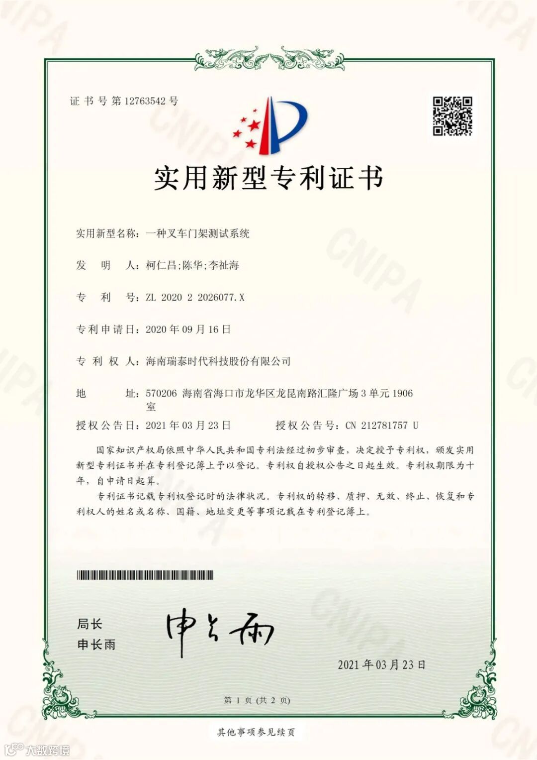 近日,瑞泰时代科技荣获五项实用新型专利,这是瑞泰时代科技于2020年9月实现《叉车门架模拟试验检测装置》《一种叉车检测设备》《一种叉车门架测试系统》《一种货架维护系统》《一种用于叉车设计的培训模型架》的专利破冰,共获得5件专利授权。
