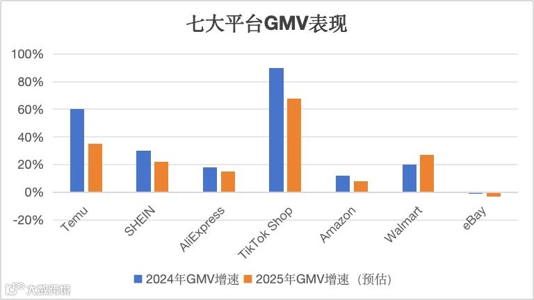 2025年七大平台依然活跃,但是面对复杂多变的市场环境,各大电商平台加快转型升级或战略转型,整个行业格局正在重塑。美国本土三雄(亚马逊、沃尔玛和eBay)受到的冲击相对较小,市场地位继续得到了强化,其中亚马逊增速开始变缓,eBay甚至出现负增长,只有沃尔玛电商表现出色。而中国出海四小龙很明显受到关税或监管收紧的重大影响,和去年相比增速下降并且都进入战略调整期。