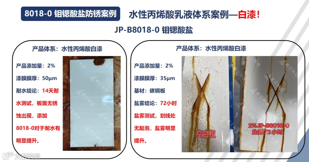 B8018-0 钼锶酸盐,添加量 2%,可成功配制出符合市场要求的水性轻防腐钢构白漆。其在水性丙烯酸体系中,可显著提升涂膜耐水性与耐盐雾性,有效解决市场浅色防锈颜料适配难题。具体应用案例详见下图。