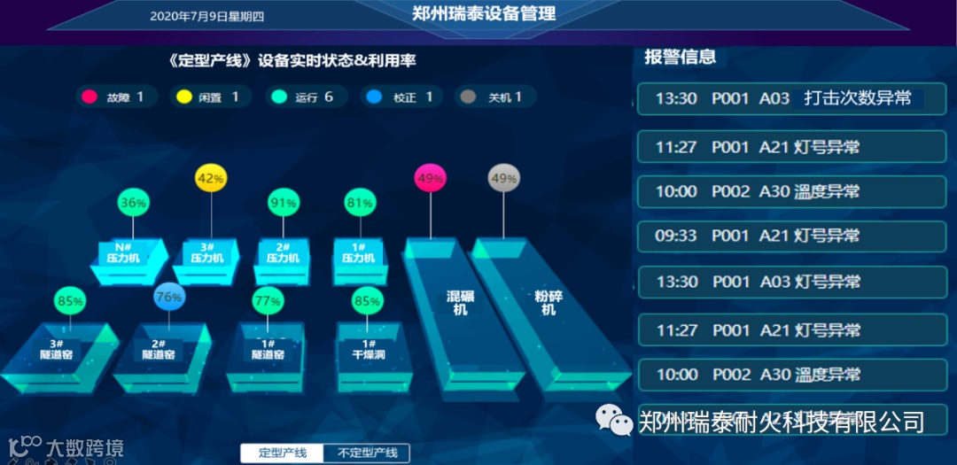 目前,郑州瑞泰智能车间管控系统实现了耐火材料制造过程中的全部数字化管理与控制,包括生产计划、作业派工、库存等管理以及设备联网、数据自动实时采集、工业大数据分析和现场看板化展示等。在生产过程中,从粉碎、配料、成型、烧成、检测、包装流程全面实现自动化、数字化、网络化、智能化。