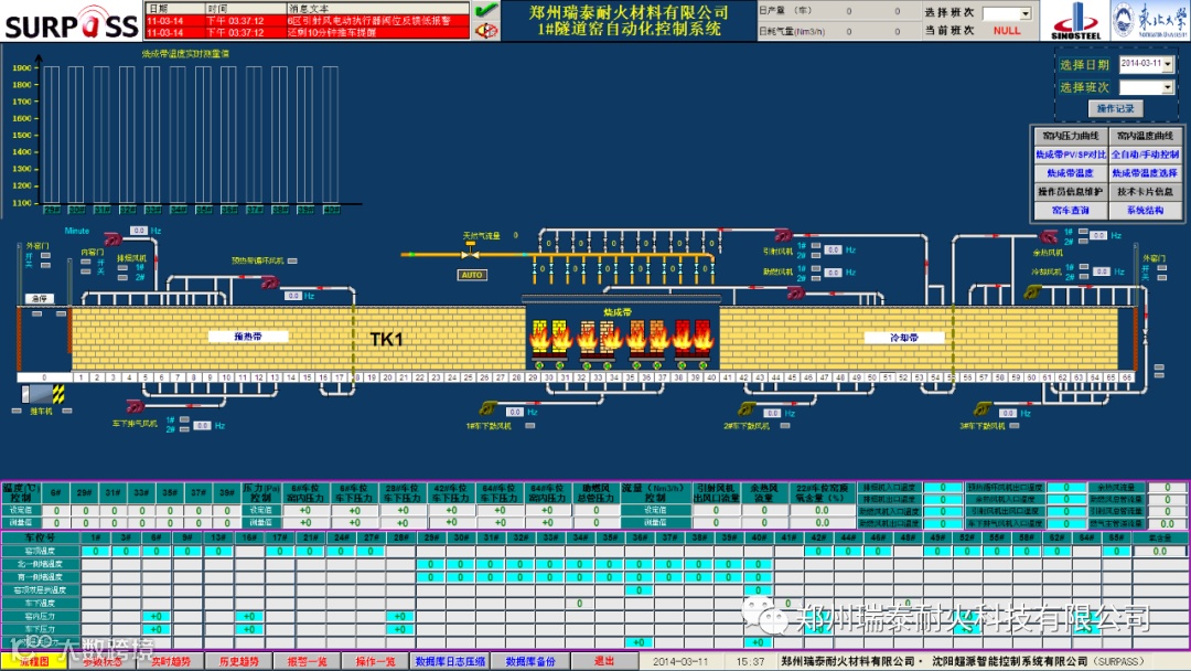 郑州瑞泰智能车间共建设3条耐火材料生产线,上线实施MES系统,并实现与ERP、DCS、PLC等系统的集成运行。采用条码管理系统,通过在PLM系统中使用,实现对产品全生命周期质量实时追溯。通过线上质量管理系统,产品质量信息可在线自动检测、自动记录。集控系统提供隧道窑、环保设备各项指标实时监测管理,具有数据采集、显示、存储、统计报表、打印、告警等功能。建立管控一体的中央控制室,主要用能设备实现实时监测与控制。创建软硬件安全运行环境,确保网络安全应急响应、实时恢复及安全可控。