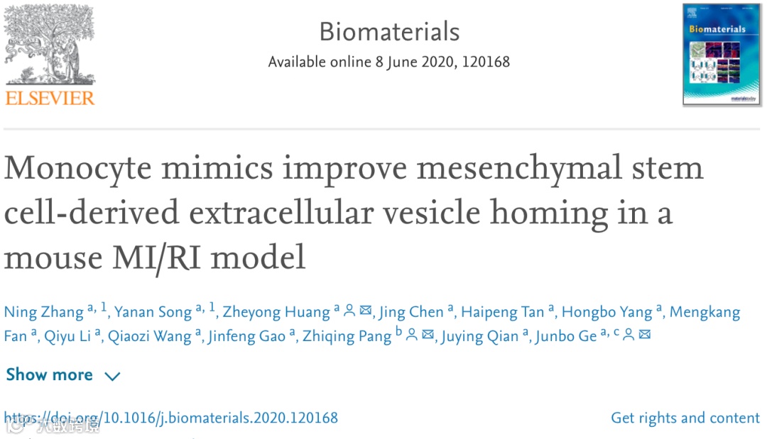 复旦大学附属中山医院心内科葛均波院士、黄浙勇副教授与复旦大学药学院庞志清副研究员合作开发了一种单核工程化修饰的间充质干细胞外囊泡,用于增强干细胞外囊泡对缺血性损伤心肌的归巢和修复作用。相关成果于6月8日以《单核细胞仿生物修饰间充质干细胞外囊泡改善其对小鼠心肌缺血再灌注损伤的归巢》(Monocyte mimics improve mesenchymal stem cell-derived extracellular vesicle homing in a mouse MI/RI model) 为题在线发表于生物材料与组织工程领域国际著名期刊《Biomaterials》上。