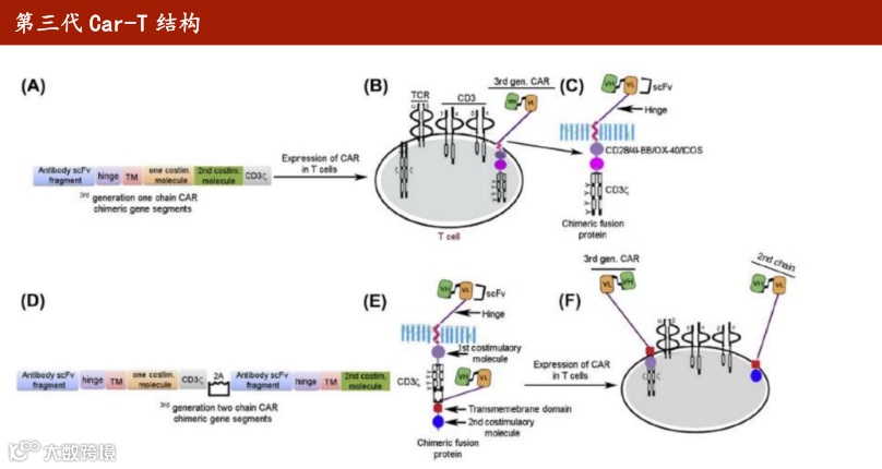 第一代CARs不包含共刺激分子。包括第一代、第二代和第三代 CARs 在内的所有CARs 都装有将 scFv 与细胞内信号结构域连接的铰链。铰链通常来自 CD8α糖蛋白或 IgG 恒定域。CD8α铰链可以通过其疏水性跨膜结构域透过细胞膜。跨膜结构域的一部分可能包含共刺激分子的序列。最后,跨膜结构域与融合内分裂素融合蛋白进行融合。融合内分裂素融合蛋白是由共刺激分子组成并融合 FcεRIγ链或 CD3ε或 CD3ζ信号域。共刺激分子通常包含融合有源自 CD3ε序列胞内信号传导域的 CD28 或 4-IBB 或 OX-40。除 scFv 之外,第三代 CAR 还包含融合有单链单载体上(例如逆转录病毒载体)或双链单载体上(例如逆转录病毒、慢病毒载体)CD3ζ内结构域的两个共刺激分子。裂解后的双链单载体表达两条链,其中一条链含有融合有共刺激分子和 CD3ζ内域的 scFv,而另一条链可能会产生融合有共刺激分子,但没有 CD3ζ内域的 scFv。