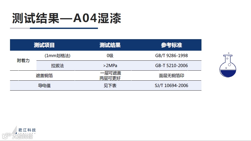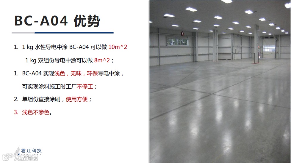 BC-A04 是君江公司针对防静电水性涂料市场,推出的新型单组分水性导电中涂,采用全新纳米导电材料。它是一款高效水性导电中涂,具有颜色浅,施工方便,对漆膜表观影响小等优势。