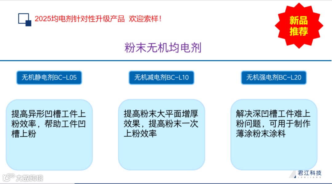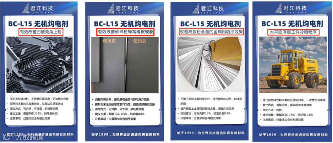 紧接着,围绕上粉问题展开深度分享,直击粉末涂料生产实践中高频出现的上粉效率难题。针对这一行业痛点,他重点推介了君江科技在粉末涂料行业中的明星产品BC-L15,均电剂BC-L15于2017年由君江科技研发生产并率先在粉末涂料领域推广,打破传统上粉助剂的概念,创新性地通过无机导电材料的导电原理用于改善粉末涂料静电涂装,经多年来粉末涂料市场检验,该产品逐步成长为君江科技在粉末涂料无机功能助剂板块的标杆产品,现已形成强大的市场竞争力:在粉末涂料行业产量TOP100的粉末生产企业中,超60%曾应用均电剂BC-L15,切实提高粉末涂料静电涂装质量,有效解决上粉困难的问题,头部客户群体的广泛应用也验证了BC-L15的技术可靠性。经多年市场推广,大量粉末涂料生产反馈经验,均电剂具备广泛的应用适配性:不仅能解决凹槽部位上粉难、平面涂层增厚不良等基础问题,更针对砂纹粉蜂窝橘皮、金属粉阴阳面发花等复杂表面效果的导电均匀性难题提供有效解决方案,通过优化电荷分布均匀性,从根本上提升粉末涂料的施工性能。